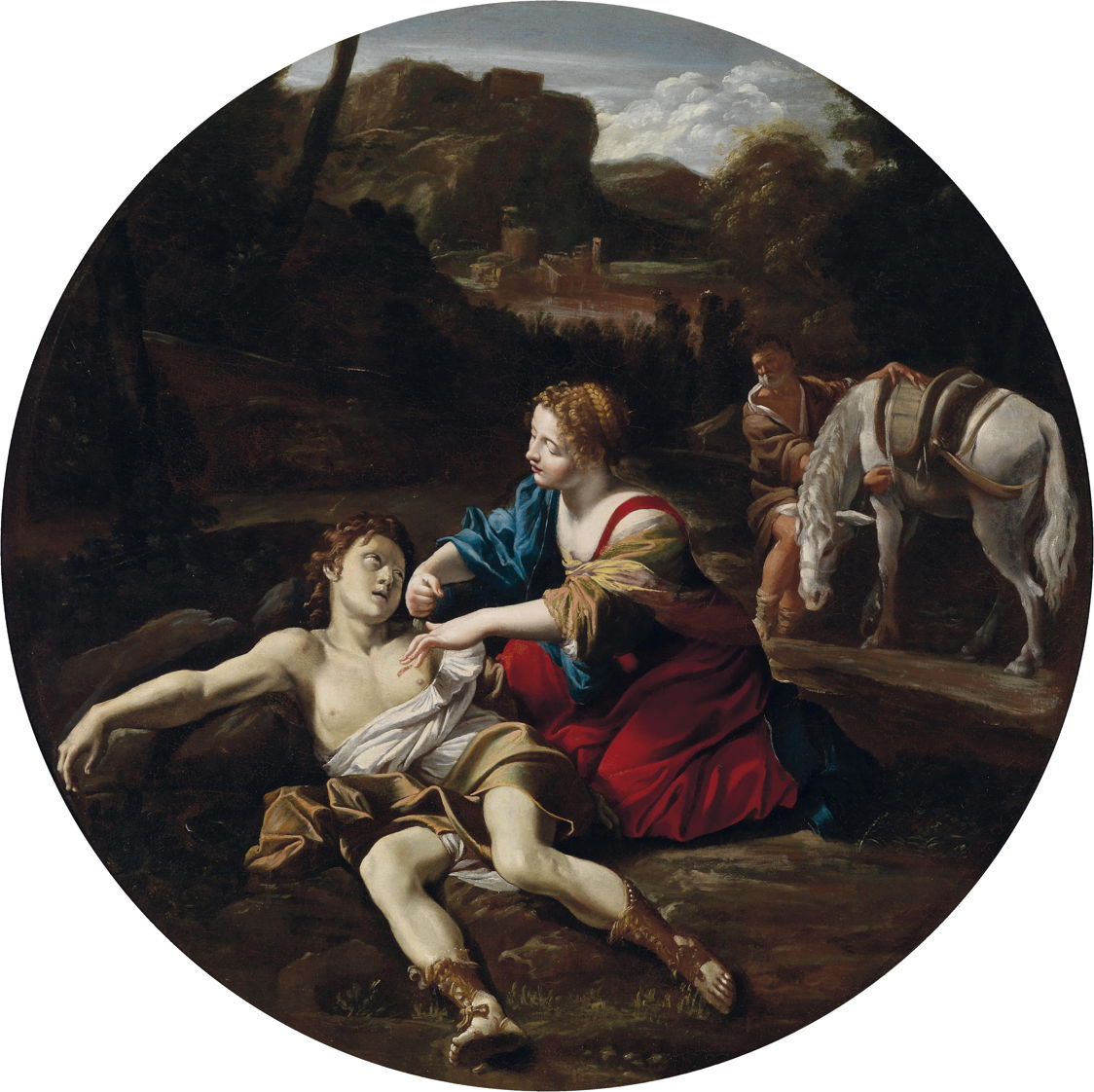 Angelica remembers seeing a herb to stop bleeding a litle way back on the path, so gathers its leaves to take back to treat Medoro. She bumps into a shepherd on horseback, who is looking for one of his heifers, and enlists his help in trying to resuscitate the young soldier.
