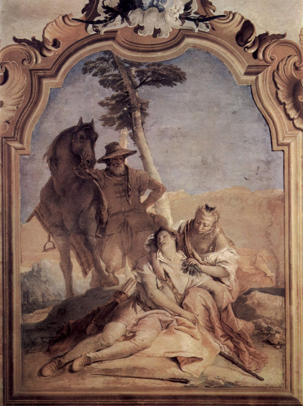 Medoro and his friend Cloridano were fighting for the Saracens at the siege of Paris. When their leader, Prince Dardinello, was killed in combat, they resolved to cross into no-man’s land, search for his body, and give it a proper burial. After dark, they set out, silently murdering sleeping Christians on the way.