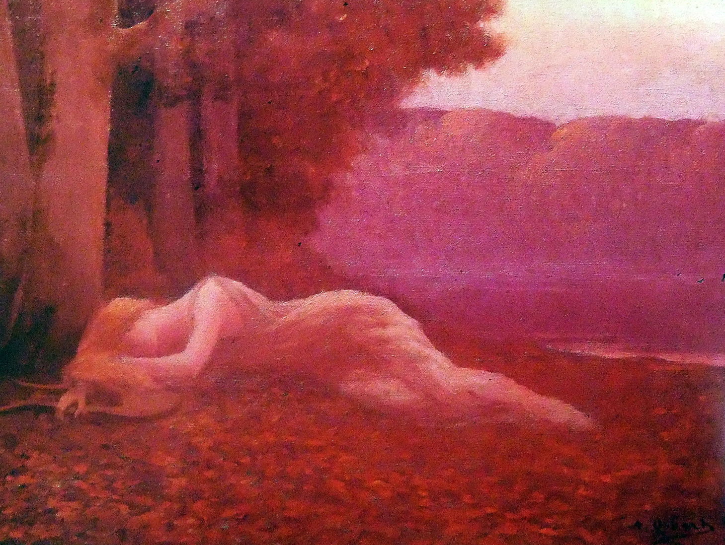 Sleeping Nymph (1905) brings a little more background detail, and the golden hair and lyre of the nymph, but has even more restricted use of colour.