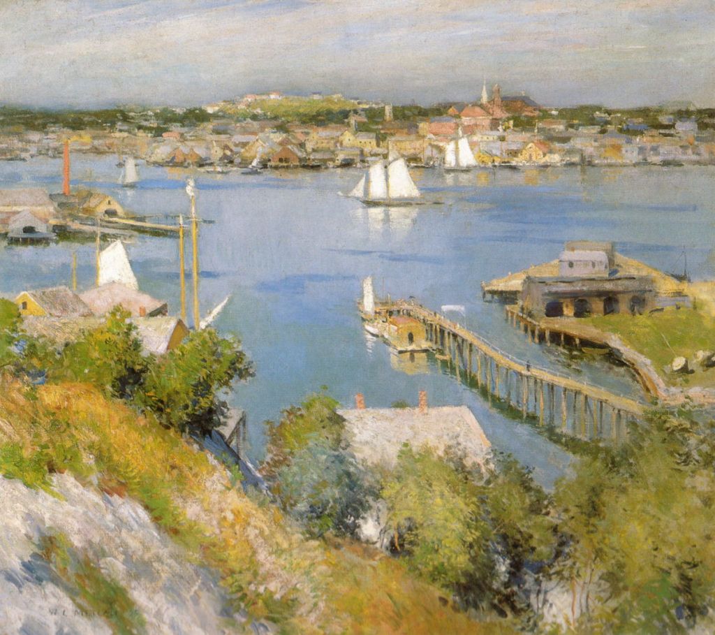 He also visited and painted Gloucester Harbour (1895). This is a view of Smith Cove in East Gloucester, looking towards its inner harbour, with the town itself on the opposite shore. It’s a superb set-piece of what had been a couple of decades earlier the busiest port in the USA. With the rapid decline of sail at the end of the nineteenth century, though, it was slowly returning to a quieter existence, with its supporting industries in steady decline. It had been popular with several major American artists, including Winslow Homer.