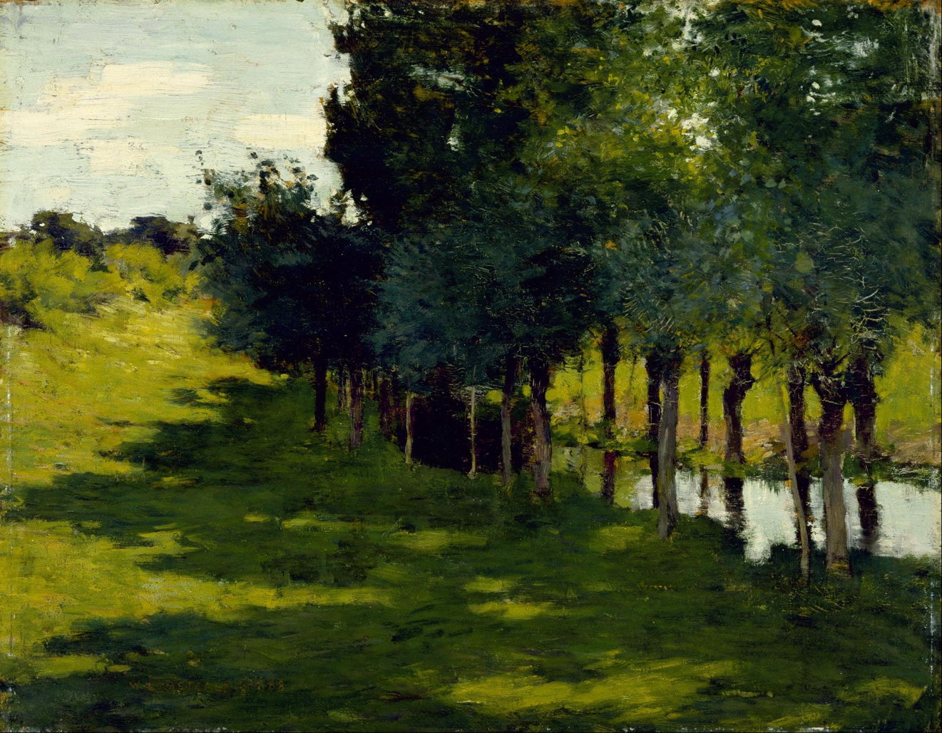 He travelled in France, visited Britain, and spent some time painting in the artists’ colony in Pont-Aven in Brittany. Among the other American painters he met in France were John Twatchtman and Theodore Robinson. He spent periods in summers from 1886 onwards in Giverny, by then the home of Claude Monet, and fast becoming an artists’ colony too. Metcalf had also painted at Grez-sur-Loing, and his landscapes from there are reputedly in Barbizon style.