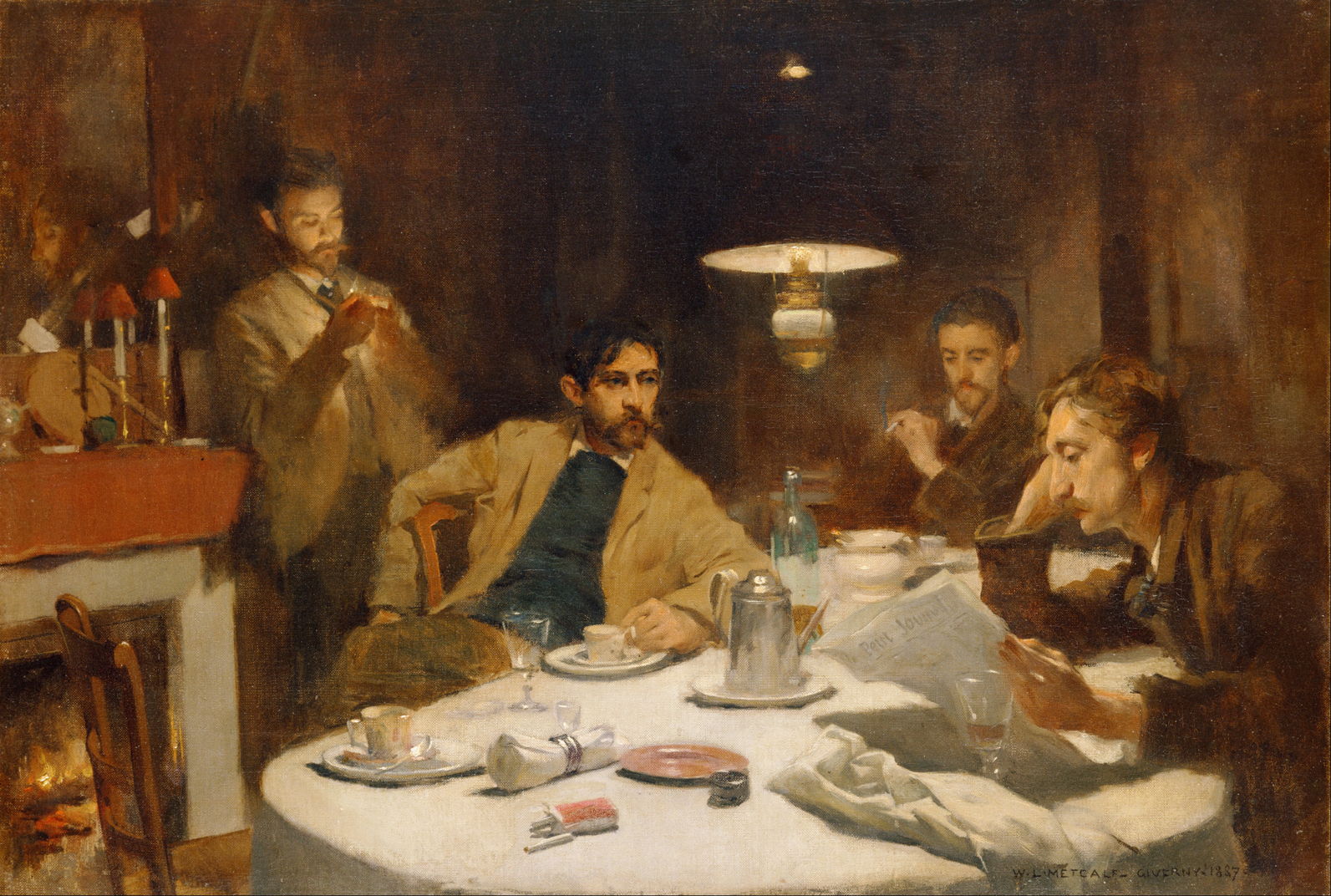 Just a couple of years later, he painted an early masterpiece, The Ten Cent Breakfast (1887), which demonstrates his skill not only with a figurative composition, but in tackling the showpieces of glassware, metal and other reflective surfaces (detail below). This presumably shows a group of his friends in France, one reading Le Petit Journal, as they drink coffee and smoke over breakfast in their lodgings in Giverny during the winter.