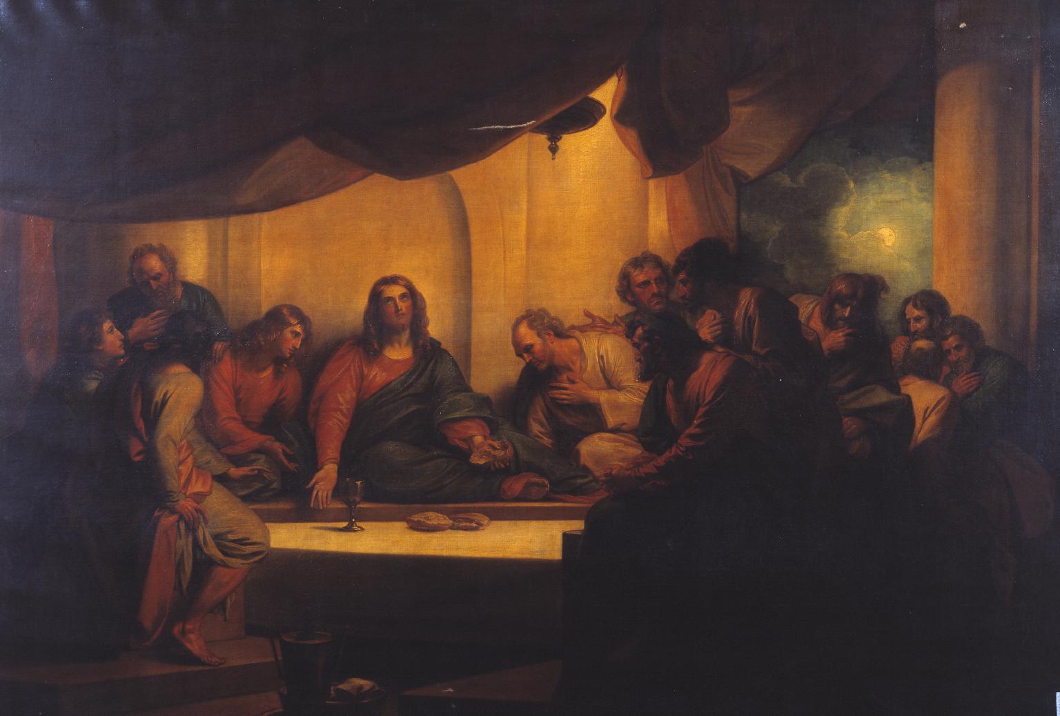 West tried The Last Supper in 1784, which appears to be one of his disappointing paintings, certainly in comparison with those of many of the great Masters who had preceded him. In avoiding a more formal composition, West loses the cohesion of the motif, and in so doing fails to convey its profound importance to the Christian faith.
