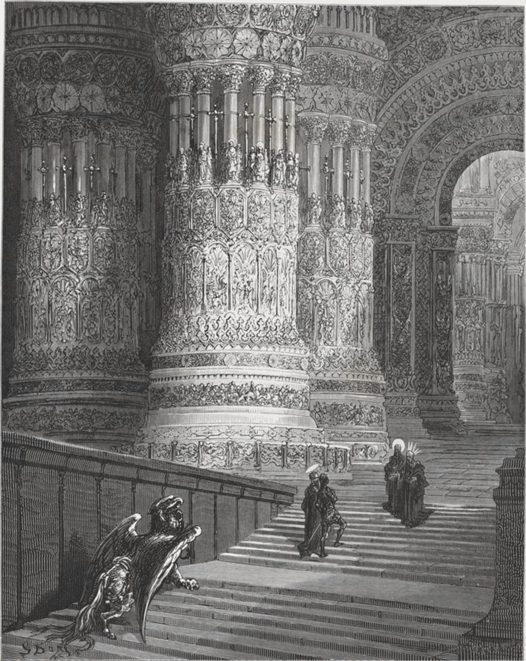 When he reaches the palace, he realises that its glow comes from a single gemstone which had been cut by Daedalus. At the entrance to the palace is a silver-haired figure wearing pure white robes with a red cloak. This is Earthly Paradise, and he is being welcomed by Saint John the Evangelist. The saint tells Astolfo that he has been expected, as he is to save Christendom and Charlemagne from the Saracens and Moors.