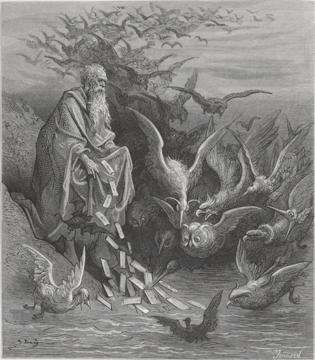Other nameplates are taken from the water by flocks of vultures and crows, who then drop them into oblivion. Just a few are taken by two silver swans, who secure their fame, when they are taken from the swans’ beaks by a nymph. Saint John explains to Astolfo how this mirrors what happens on earth. Thugs, liars and other sinners may do well at court, but will be lost to oblivion, while the few true poets in life will become eternally great, even when they’re neglected by their patrons.