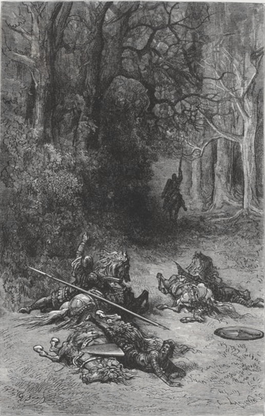 Rodomonte agrees to free all those he’s captured, including those he has sent to slavery in Africa, should she defeat him, but proposes that she submit to his lust for her if he is the victor. Bradamante ignores his insolence and prepares to charge. She strikes him square with her golden lance and knocks him to the ground. Rodomonte is astonished, and takes his time to get up. He instructs his esquire to free the captives and those in slavery, strips off his helmet and armour and throws them against the rocks in abject defeat. He walks away to find refuge in a cave.