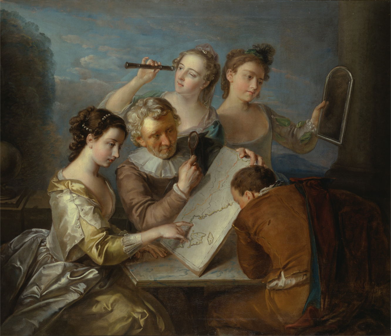 The vogue for series of paintings showing the five senses also died, although Philip Mercier’s The Sense of Sight from 1744-47 is an exception in which two charts are prominent. One of the man’s daughters is tracing with her finger on a chart of what appears to be the eastern coastline of North America, and the son is looking intently at the other map underneath.