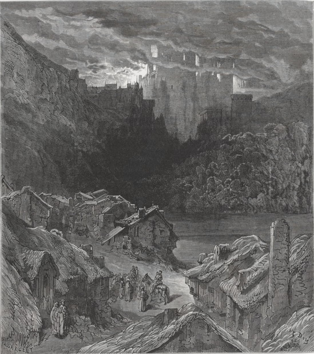 With the sun setting, they reach a small hamlet high on a crag, where they decide to stop for the night. At supper in their lodgings they notice that everyone else there is a woman, and there’s not a man to be seen. Ruggiero asks why this is, and the locals tell him that they have been separated from their menfolk and banished there by the local tyrant Marganorre, who is a cruel misogynist who behaves even worse towards women visitors, as shown by his treatment of Ullania and her companions.