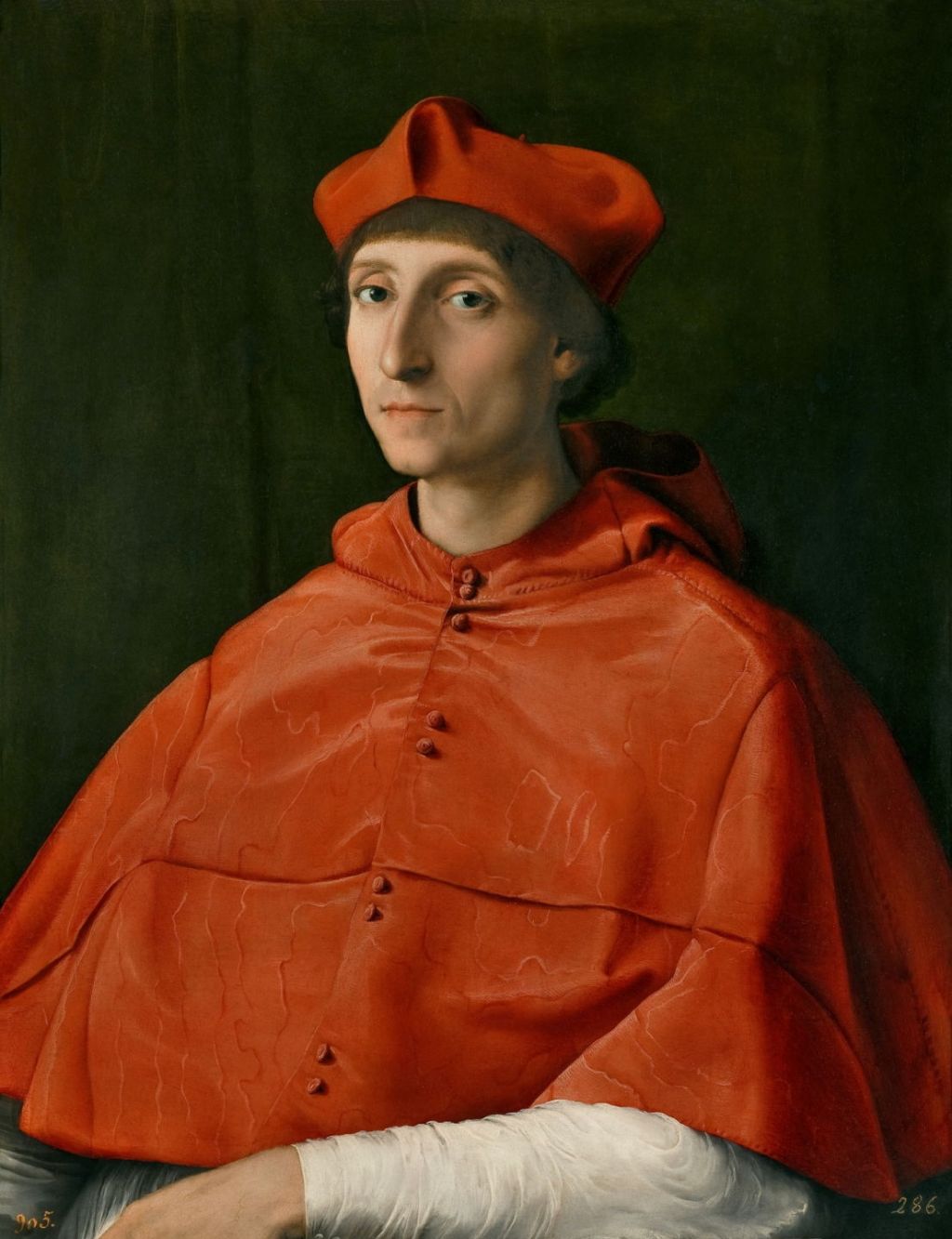 Raphael’s slightly earlier Portrait of a Cardinal from 1510-11 most probably shows Ippolito d’Este, commonly known as the Cardinal of Ferrara. He was the brother of Beatrice and Isabella d’Este, so the brother-in-law of Ludovico Sforza. His oldest brother Alfonso married Lucrezia Borgia. This adds another piece to the jigsaw puzzle of patronage at the time.
