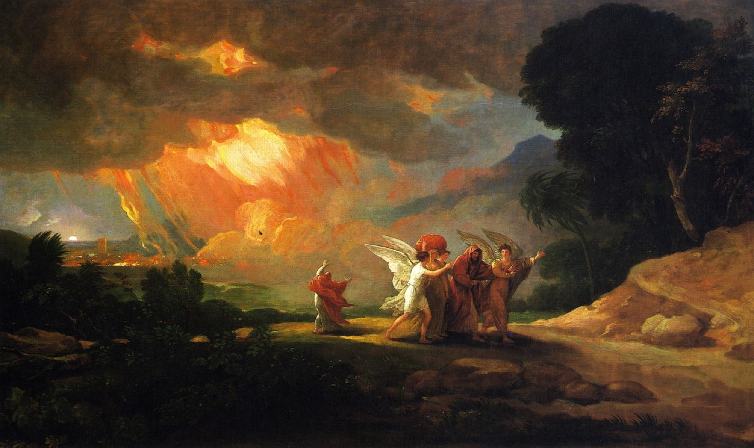 It is that moment which West chose for his painting: Lot’s wife stands alone, her arms raised at the truly awesome sight of the destruction of the cities, and is just about to be turned into a pillar of salt. Lot and his daughters are being ushered away hastily by two winged angels.