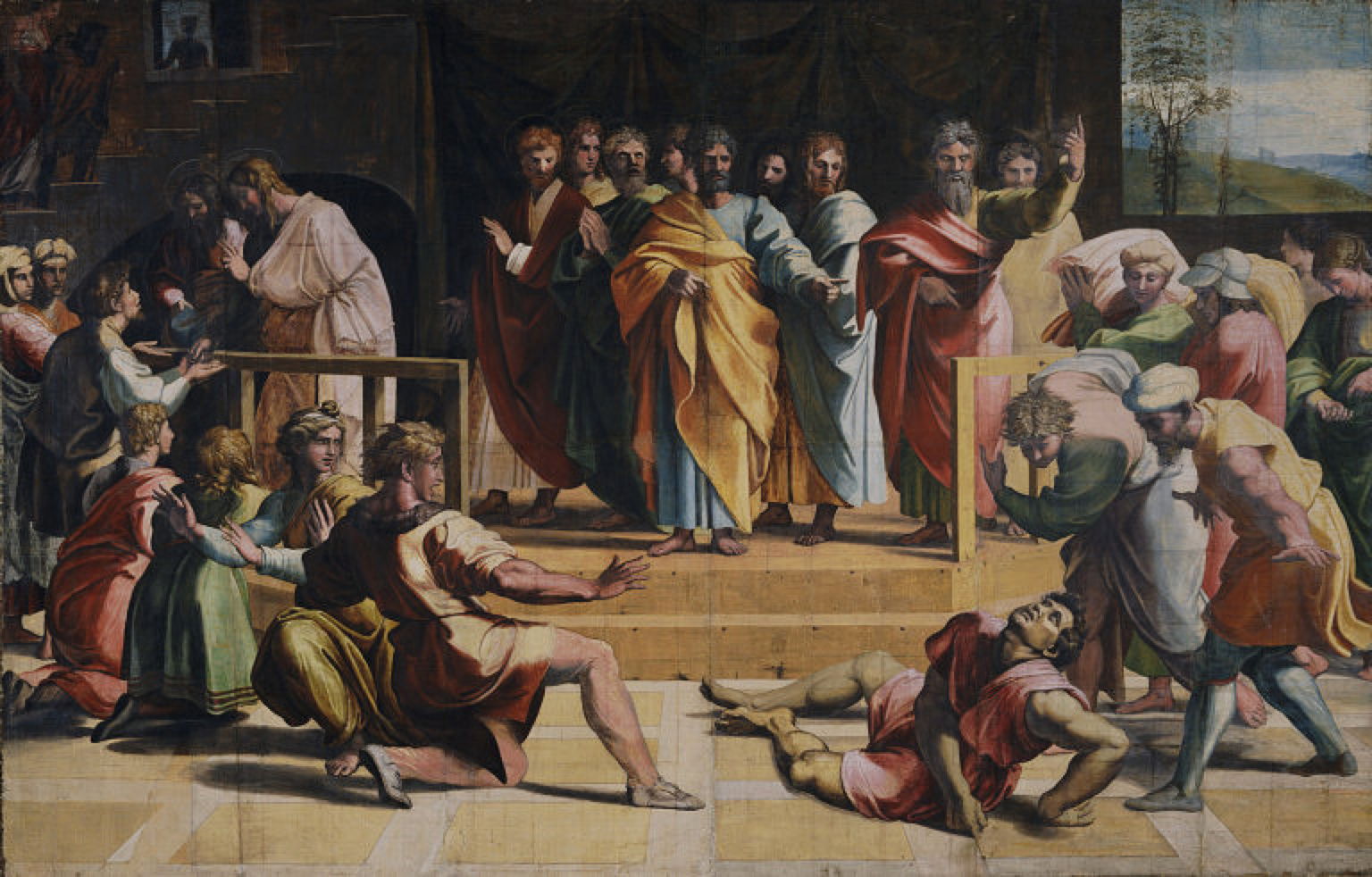 The Healing of the Lame Man refers to the Acts of the Apostles Chapter 3, verses 1-7, which contains the story of a man who was ‘lame’ from birth. He was taken to the Temple gate known as Beautiful to beg. When he asked Peter for money, the apostle told him to get up and walk, then gave him a hand up onto his feet. The ‘lame’ man went away on his own legs rejoicing. Raphael shows the moment at which Peter performs the miracle, his hands held together in prayer.