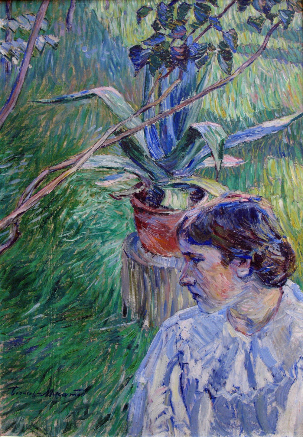 Musatov also switched to painting in a combination of oils and tempera, as in this Self-portrait with Sister from 1898, which shows his sister Yelena together with another agave plant, this time in a wooden tub on a stone pedestal. She is very elegantly dressed, and holds a folded fan on her lap.