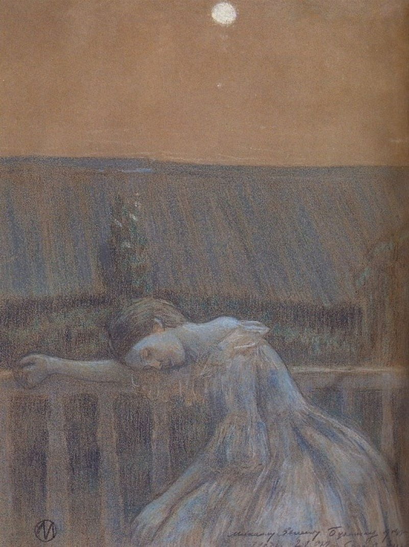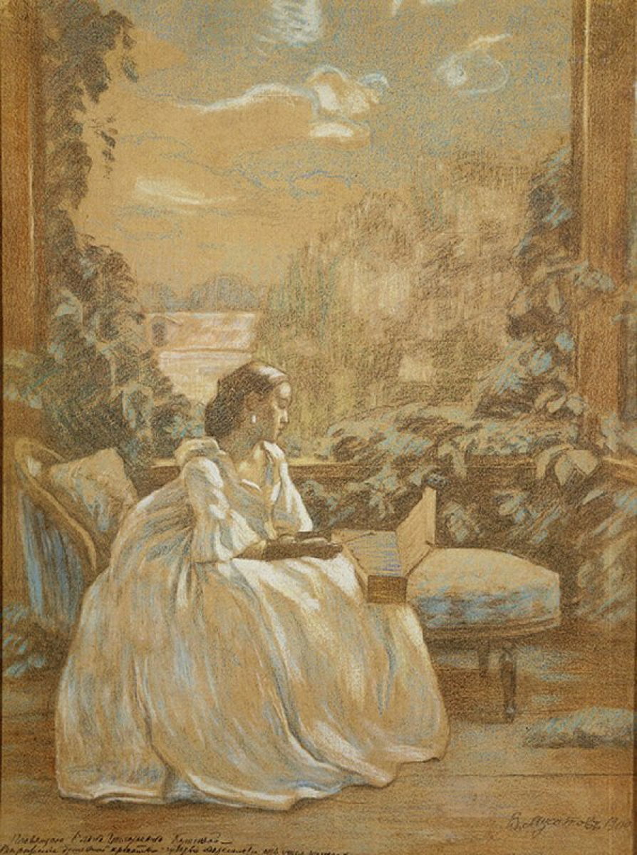 As well as painting in oils and tempera, he used pastels, as seen in A Romance from 1900. There’s an indecipherable dedication at the bottom left, suggesting that he painted this for the woman who appears to be playing a xylophone or similar musical instrument. This could be his fiancée Yelena Alexandrova.