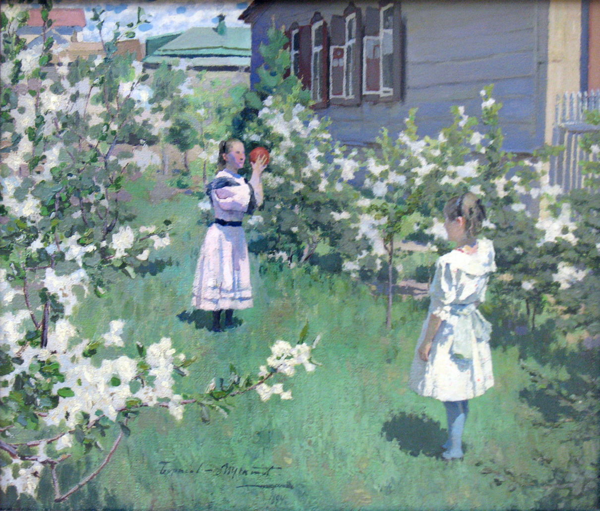 Musatov painted May Flowers in 1894, when he was still a student in Moscow. Two girls are playing ball in the middle of a Spring day, in full sunshine, amidst the rich white blossom on surrounding shrubs and trees.