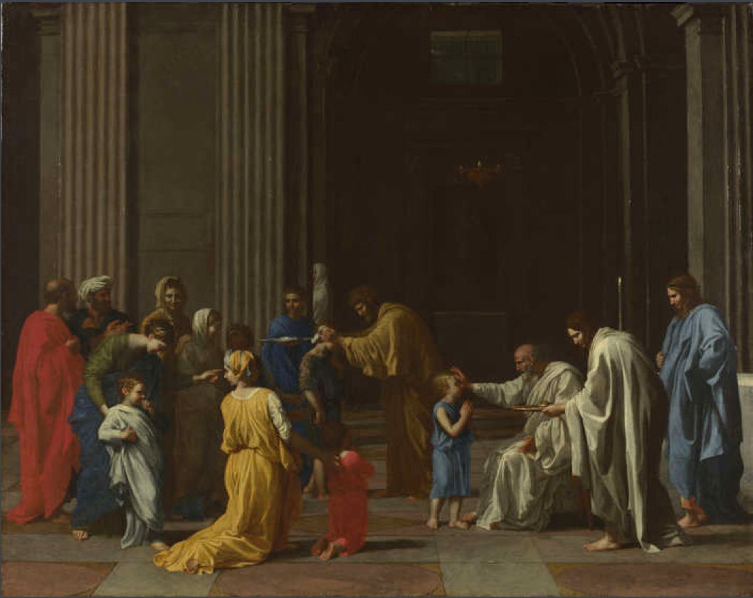 For the sacrament of ordination, Poussin chose Christ Presenting the Keys to Saint Peter, in a very different composition from that woven into tapestry in the Sistine Chapel from Raphael’s cartoon of more than a century before. This is one of Poussin’s earliest lyrical paintings of trees, as shown in the detail below.