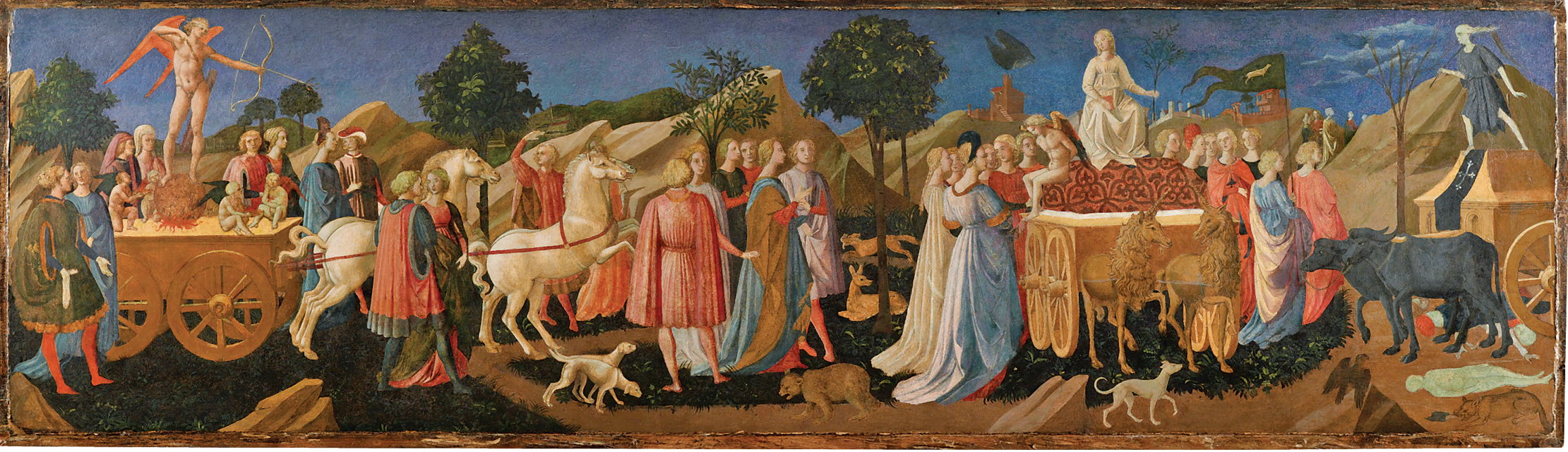 In Francesco Pesellino’s Triumphs of Love, Chastity, and Death from about 1450, the cart at the right, representing chastity, is drawn by a pair of golden unicorns. They contrast with the hearse at the right edge, which is drawn by two black oxen, and love’s chariot at the left, with its four white horses.