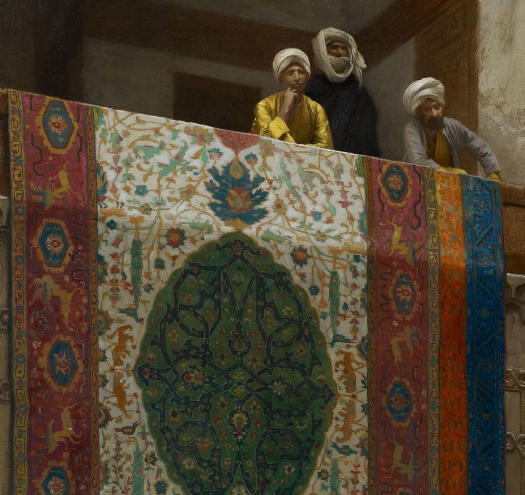 Jean-Léon Gérôme’s Carpet Merchant (of Cairo) from 1887 shows a trading scene in almost photographic detail. Standing on and among crumpled up carpets in this corner of a souk is a group of traders and their customers, admiring one particularly fine example hanging from a balcony as they haggle over price. As an image within an image, Gérôme paints the carpet with its calligraphic design in painstaking detail (below).