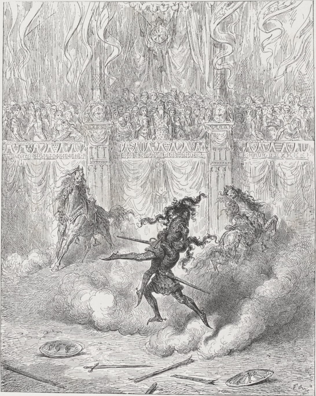 Gustave DorĂ© (1832–1883), Having Refrained from Wearing Arms for a Year, a Month and a Day After Bradamante Bested Him at the Narrow Bridge, Rodomonte Appears to Combat Ruggiero on the Lovers’ Wedding Day. The Climax of the Duel, When Ruggiero Lifts Rodomonte Bodily (Canto 46:134) (c 1878), engraving in book published by Hachette et Cie, Paris, 1879, dimensions not known, Bibliothèque nationale de France, Gallica collection. Via the Internet Archive.