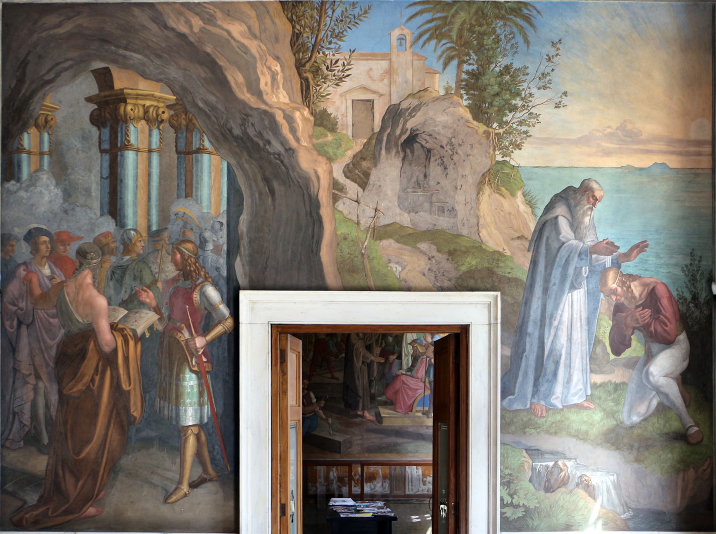 On the ninth and final day of the wedding celebrations, in the midst of a grand banquet, a knight in a black surcoat rides up and challenges the bridegroom as an apostate. This leads to a final nerve-racking duel between Ruggiero and Rodomonte. In this fresco wall painting by Julius Schnorr von Carolsfeld in the Casa Massimo, Rome, the wedding is shown at the left, and Ruggiero’s earlier baptism on the right.