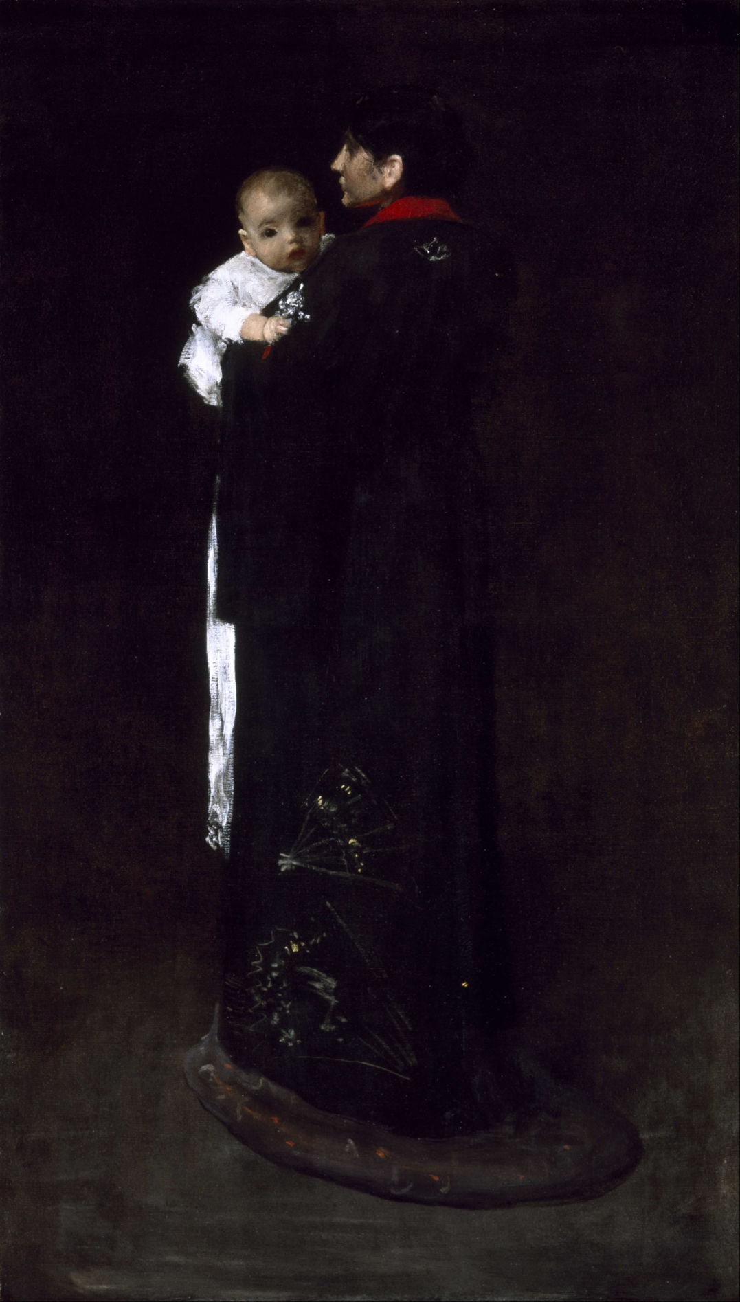 William Merritt Chase was another devoted family man who painted his wife and children at many stages of their lives. This shows his wife Alice holding the first of their eleven children, Alice Dieudonnée, nicknamed Cosy.