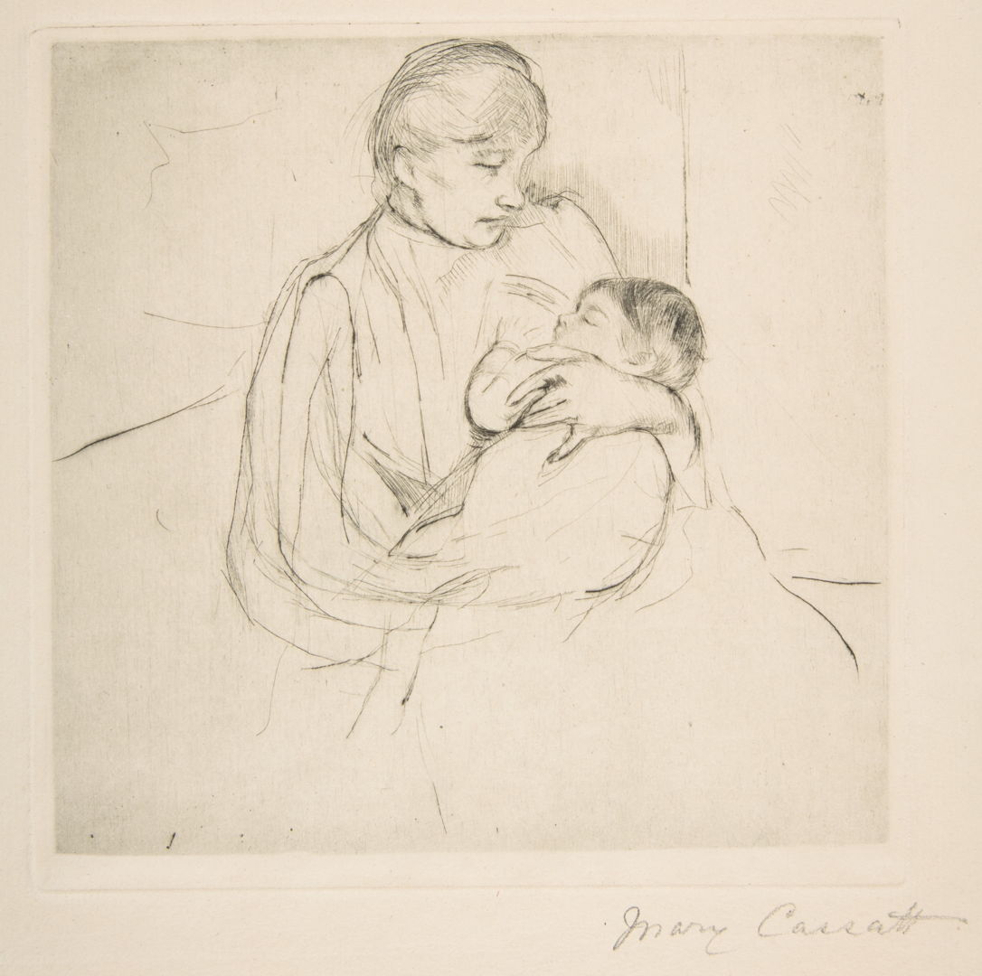 Mary Cassatt specialised in painting and making prints of children. When she was mastering drypoint technique in about 1887, she made this fine print of Baby’s Lullaby. Although this looks like a drawing, it is in fact the second of four states made from the plate.