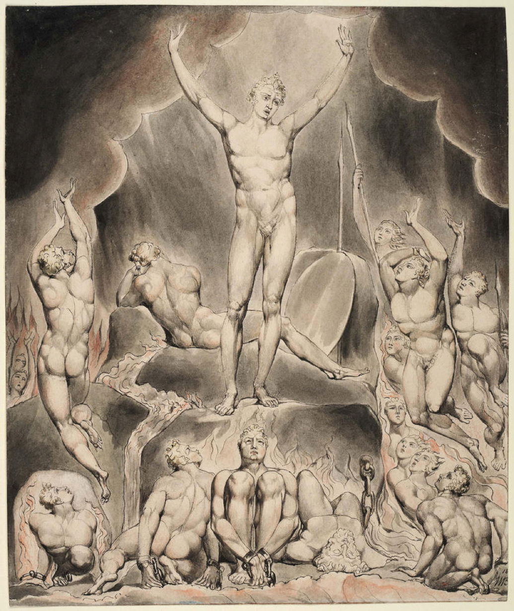 William Blake (1757–1827), Satan Arousing the Rebel Angels (Butts Set) (1808), paper, 50 x 39 cm, The Victoria and Albert Museum, London. Wikimedia Commons.