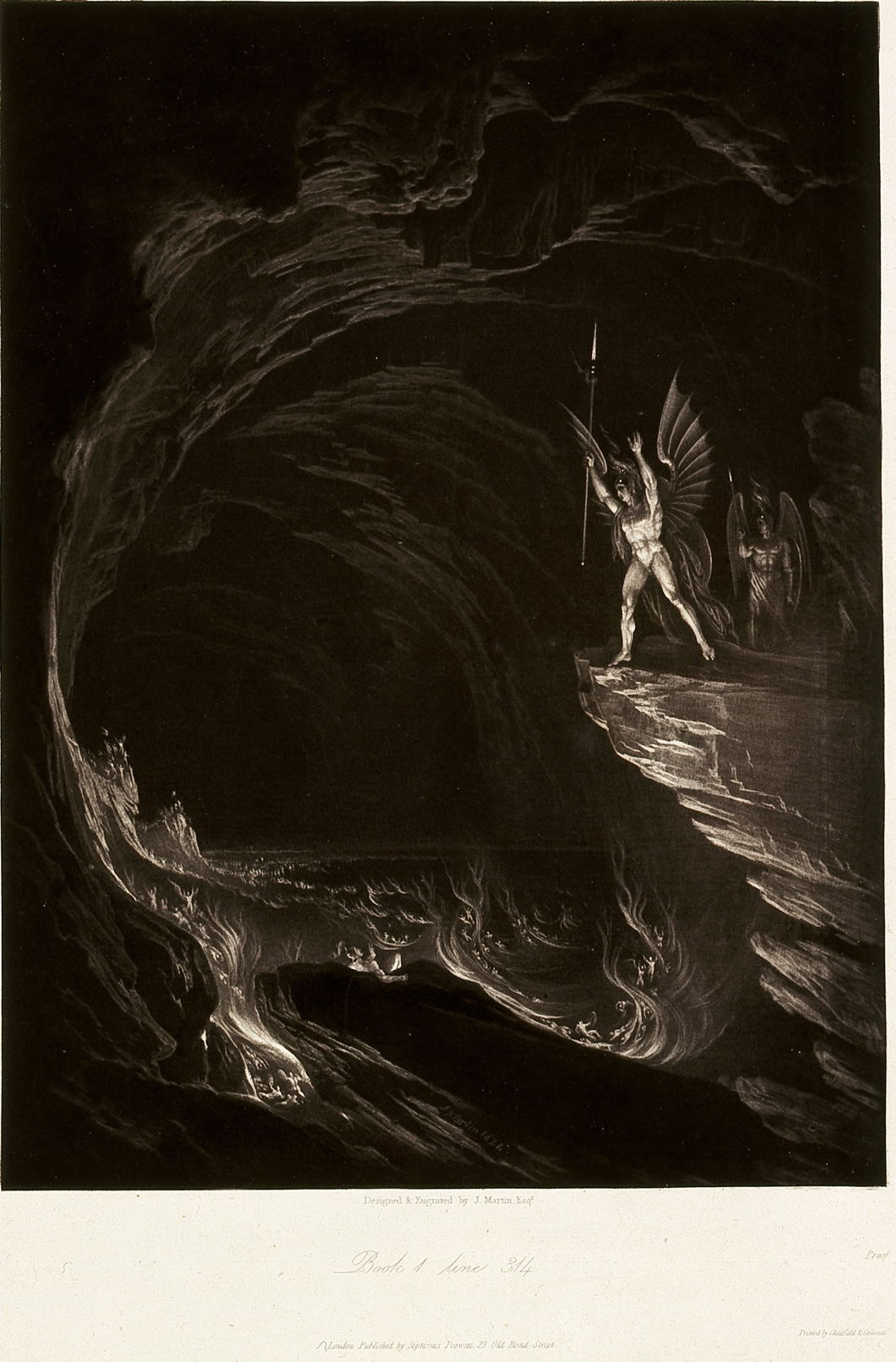 John Martin (1789–1854), Satan Arousing the Fallen Angels (Book 1, 314) (1824), print on paper, dimensions not known, Blanton Museum of Art, Austin, TX. Wikimedia Commons.