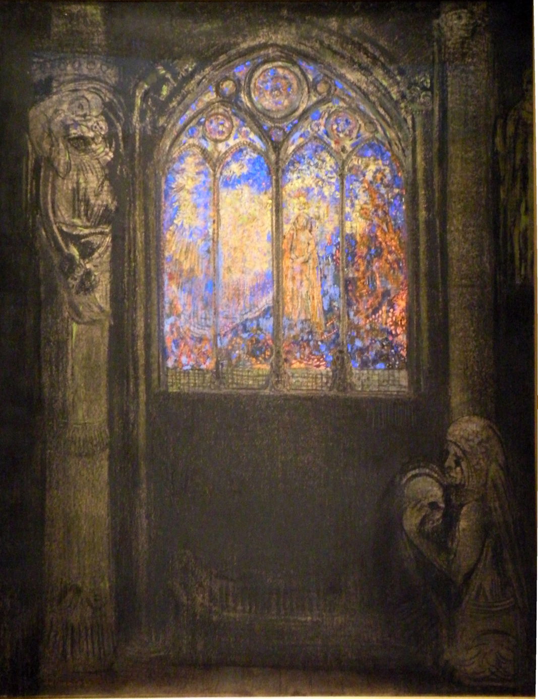 Le grand vitrail (The Large Window) (1904) is one of the most remarkable pastel paintings that I have seen. Framed by carved masonry shown in the dull greys of charcoal, a mediaeval stained glass window dazzles with its bright, rich colours.