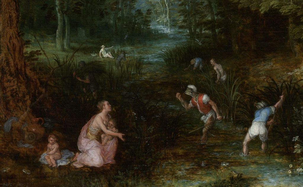 Jan Brueghel the Elder’s panel showing Latona and the Lycian Peasants from 1595-1610 is set in a dense forest – probably quite inappropriate for Lycia – where the locals are busy cutting reeds and foraging. Latona, at the bottom left, is seen remonstrating with a peasant, over to the right.