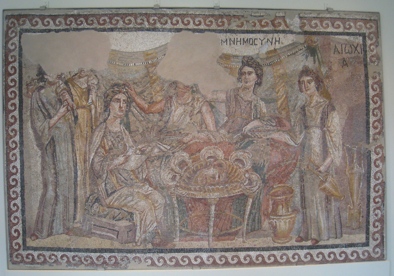 Mnemosyne appears only occasionally in visual art, and most usually in company with her daughters, as shown in this beautiful section of mosaic from Antioch in Turkey, which dates from about 100-400 CE. Thankfully its artist has followed the tradition of labelling the figures, showing the goddess as the distinguished-looking woman at the back, to the right.