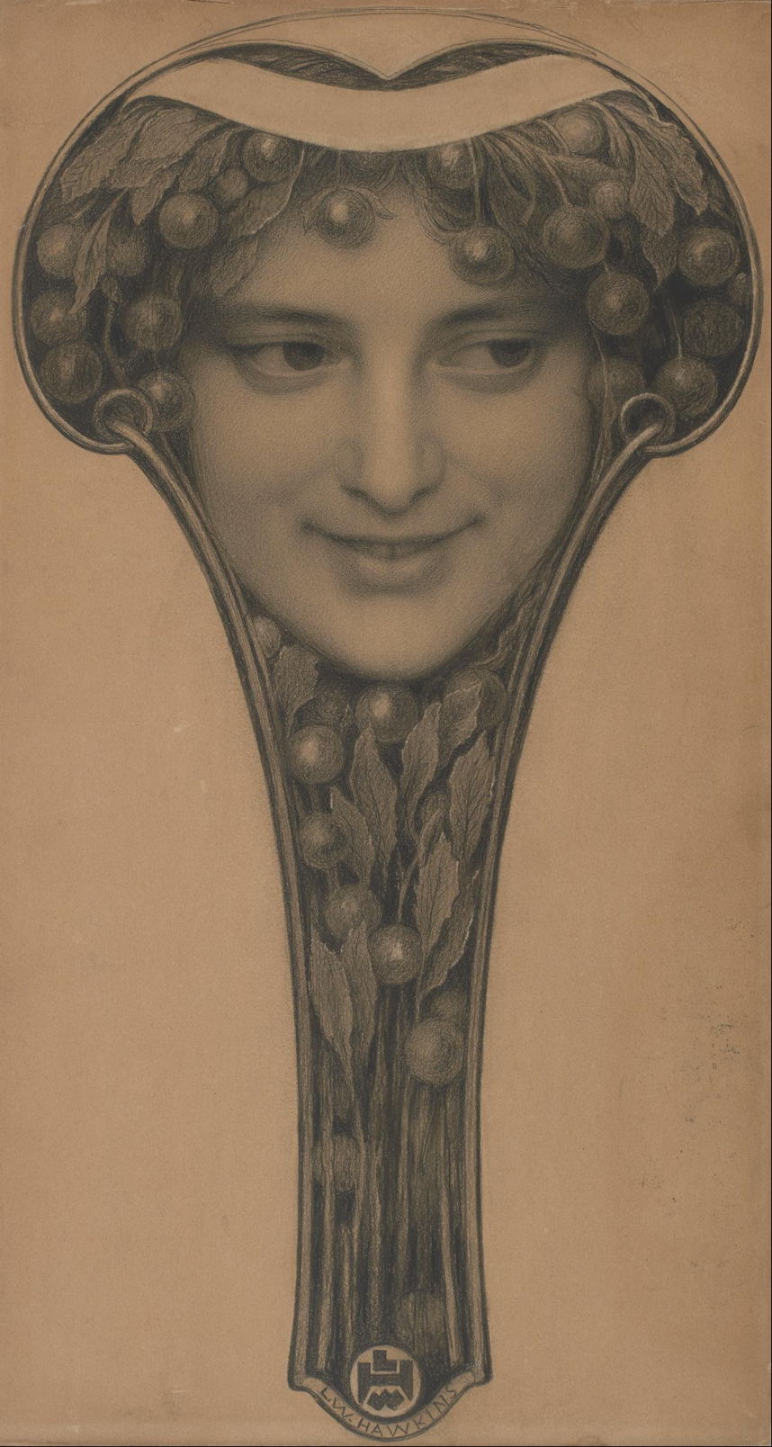 A Veil is a chalk drawing which shows Hawkins developing themes which are reminiscent of Odilon Redon and of pastels by Fernand Khnopff, such as his Voile series. Although it has been claimed to date from around 1890, it seems more likely that it was made in Hawkins’ final year or two, perhaps as late as 1909.