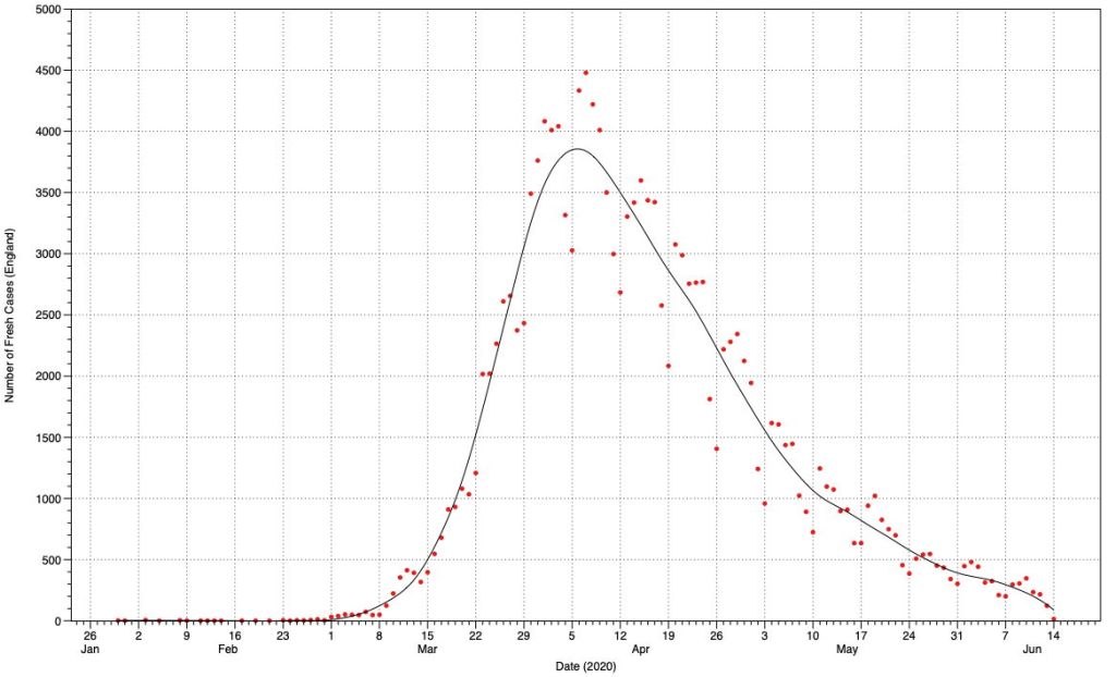 England entered full lockdown between 21-24 March, two weeks before fresh cases peaked on 6 April. Those measures have been progressively eased since the middle of May, which may correlate with the slower reduction in fresh cases into June.