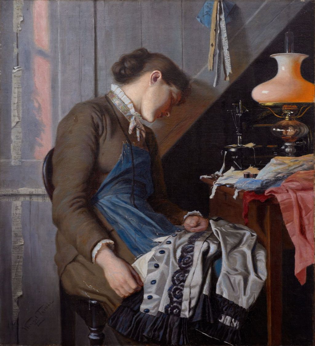 Wenzel Tornøe, a Danish genre painter, shows the impact of the introduction of the sewing machine in his Seamstress, Whit Sunday Morning of 1882, his best-known work. This seamstress had been engaged in making costumes to be worn for the Danish festivities of Pentecost (Whitsun), when many Danes rise early to go out and see the sun dance at dawn. By the time that the festival morning has arrived, she has fallen asleep over her work, exhausted.