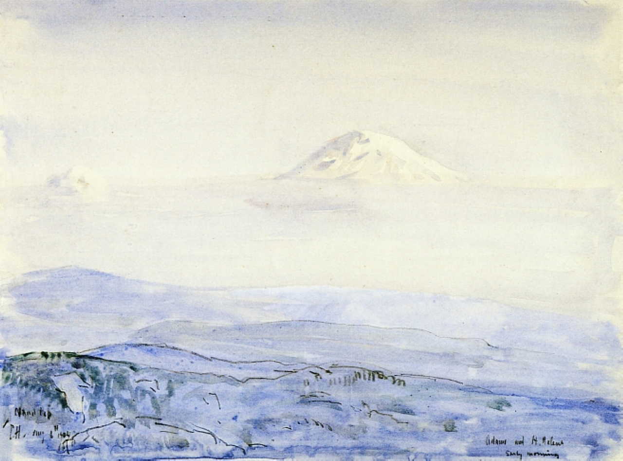My last and contrasting landscape by Childe Hassam is an example of his plein air watercolours, showing the distant peak of Mount Saint Helens, in Washington State. This view reminds me of flying (not too near) this stratovolcano, which underwent major eruption in 1980.