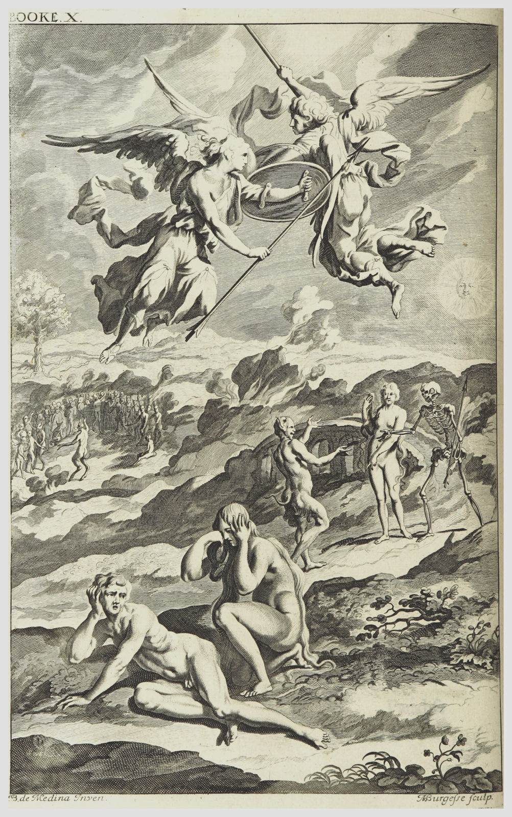 Sin and Death sitting till then at the gates of Hell, by wondrous sympathy feeling the success of Satan in this new world, and the sin by Man there committed, resolve to sit no longer confined in Hell, but to follow Satan their sire up to the place of Man: to make the way easier from Hell to this world to and fro, they pave a broad high-way or bridge over Chaos, according to the track that Satan first made; then preparing for Earth, they meet him proud of his success returning to Hell; their mutual gratulation.