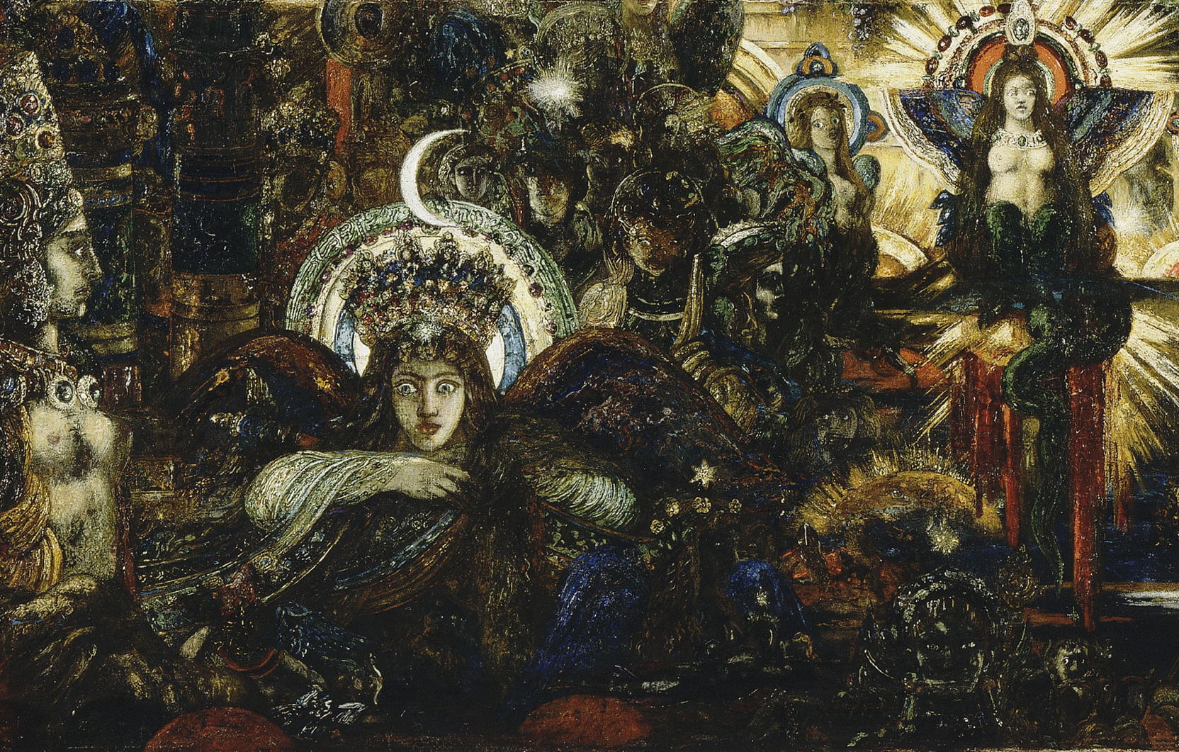Gustave Moreau also gives us few clues that Hecate is lurking at the foot of his late masterpiece Jupiter and Semele (1895). As shown in the detail below, the only clue is the crescent moon floating above her head.