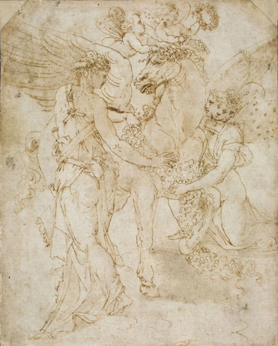 Francesco Primaticcio’s drawing of Diana and the Tripled-Faced Hecate with Pegasus from the sixteenth century is unconventional in showing her as three-headed, and with butterfly wings. She is kneeling at the head of the winged horse Pegasus, opposite the huntress Diana, with whom myths became confounded.