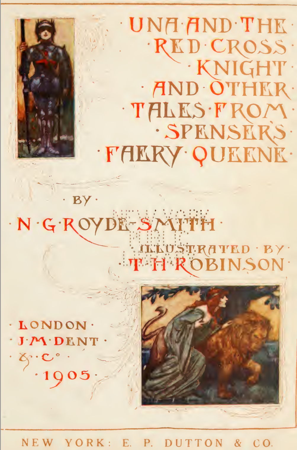 N G Royde-Smith’s retelling in Una and the Red Cross Knight and Other Tales from Spenser’s Faery Queene published by JM Dent in 1905, was illustrated in colour by Thomas Robinson (1869-1954), brother of one of the iconic draftsmen of the early twentieth century, W Heath Robinson. While the Heath Robinson is known still for his cartoons of elaborate mechanisms and contraptions, Thomas was a prolific illustrator of books for children.
