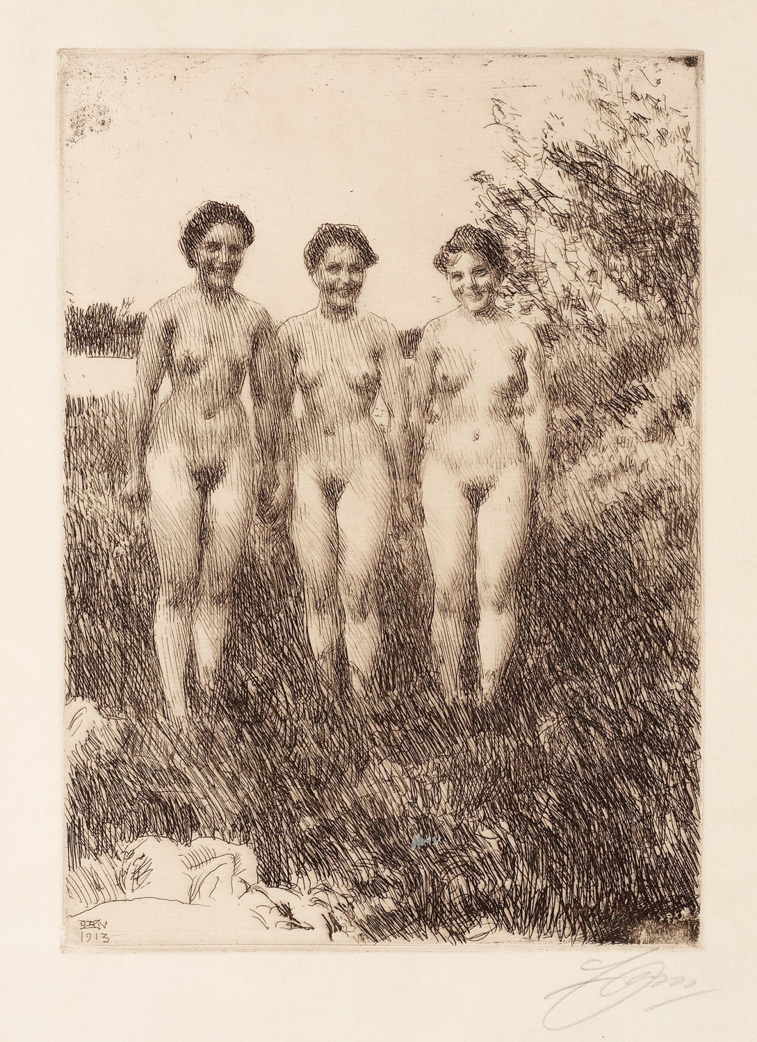 Although this etching of Three Sisters from 1913 retains some of the spirit of his outdoor nudes, and his distinctive style, it has drifted perceptibly towards the type of image to be seen in early ‘girly’ photographic magazines.