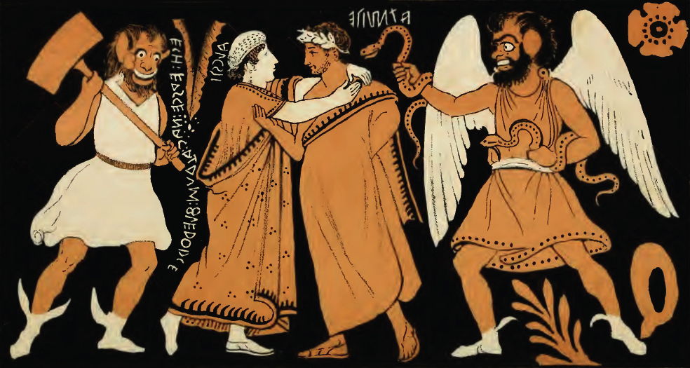 - the winged Etruscan female angel of death, Vanth, whose wings embrace Patroclus and Achilles;