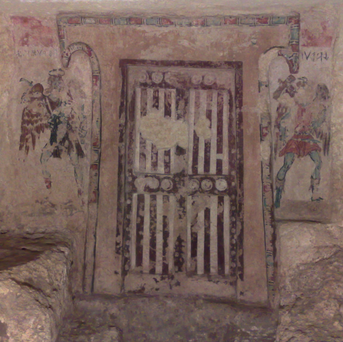 Those who fancied even more gore could peek around the corner into the vestibule of the tomb, where there is a painting of Marce Camitlnas thrusting his sword into a subjugate Cneve Tarchunies Rumach, better known as Gnaeus Tarquinius, a Roman who may have been involved in the capture of the brothers Caile and Aule Vipinas (Caelius and Aulus Vibenna).