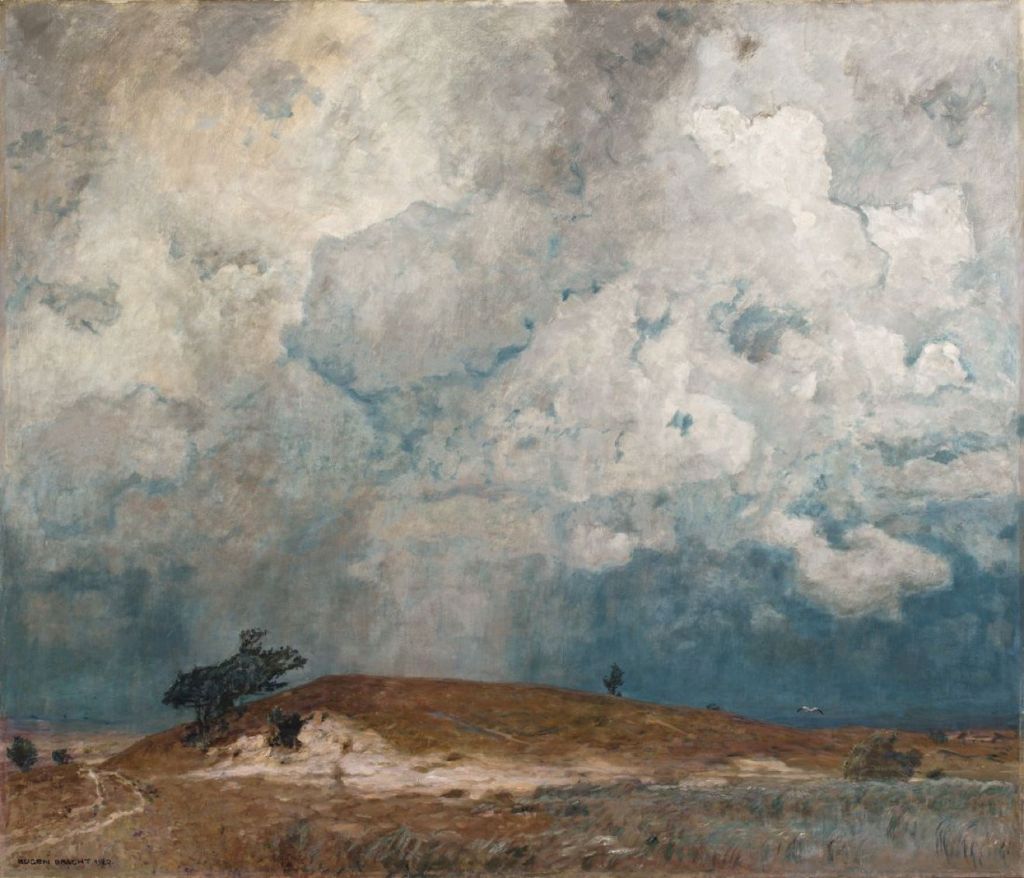 Bracht’s Stormy Day from 1920 is another fine example of his Impressionist skying, with a large bird, possibly a heron, in flight over the inky grey clouds near the horizon.