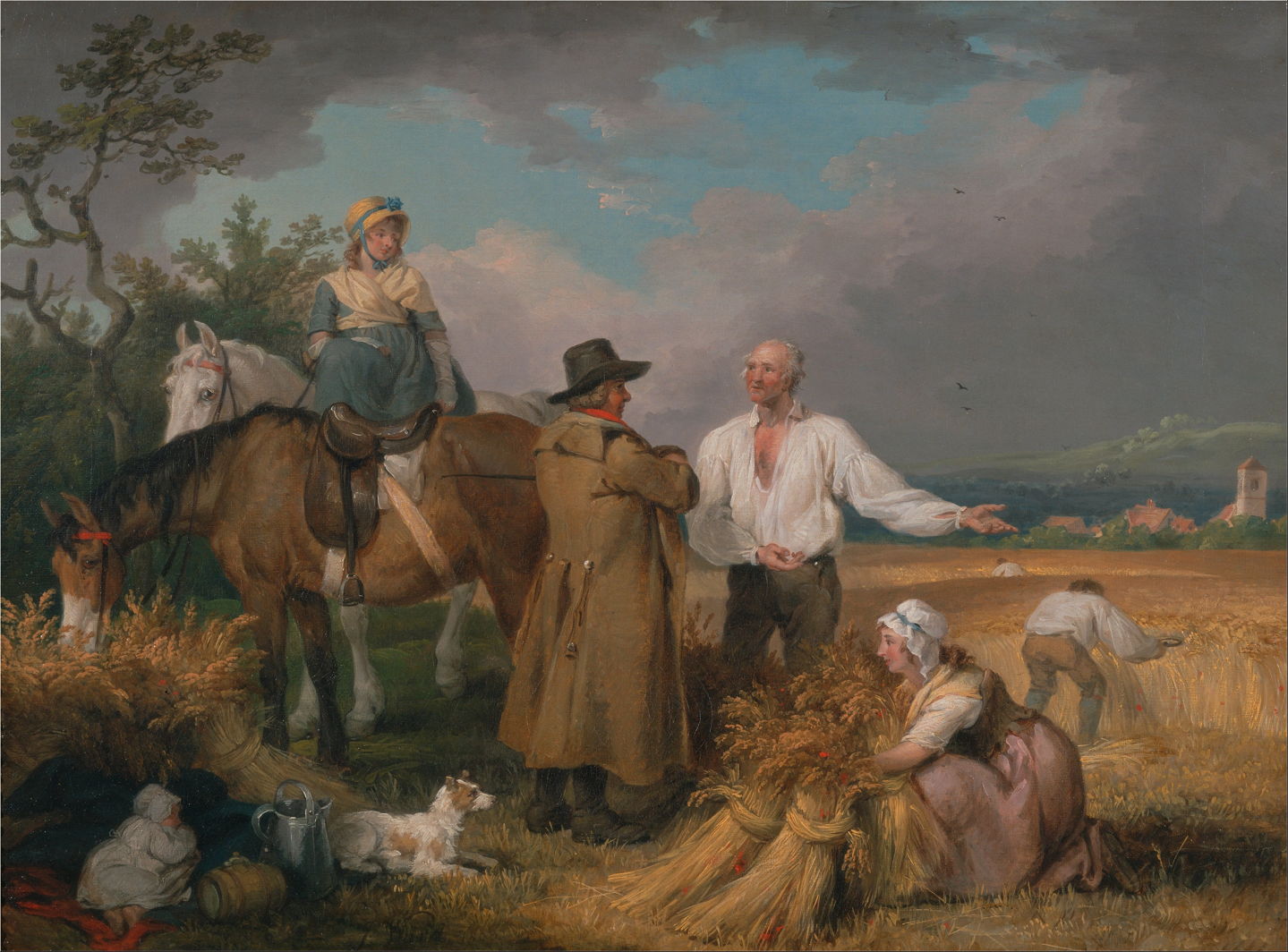 James Ward’s paintings are now little-known, but he anticipated some of the advances made later by John Constable. Ward’s The Reapers (1800) shows the squire and his wife, who have ridden out to inspect progress with the harvest. Behind them, his landscape is far more than a mere backdrop to the figures and animals, with careful play of the light from his subtle sky, on the fields, hills, and distant village. In the foreground, note the mother handling cut sheaves as she looks at the young infant asleep opposite.