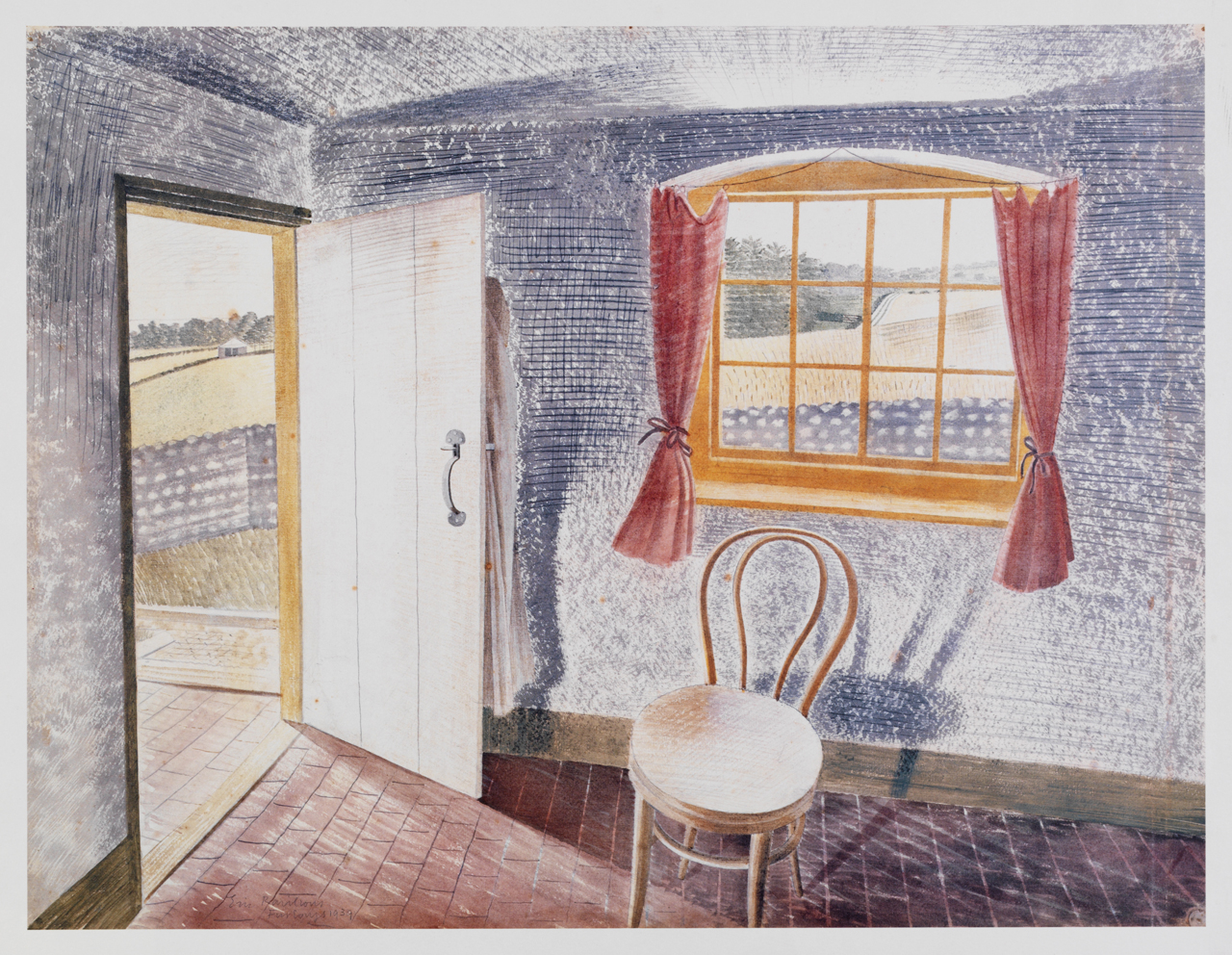 Interior at Furlongs (1939) has the appearance, and many of the traits of, a print, and combines its interior view of a largely empty room in a cottage, with one view through the open door, the other view through a closed window. The landscape shown is that of the South Downs in East Sussex. The fragmented view shows woods, a distant hut or cottage, and golden fields of grain crops, so would have been painted in the late summer, at the outbreak of war.