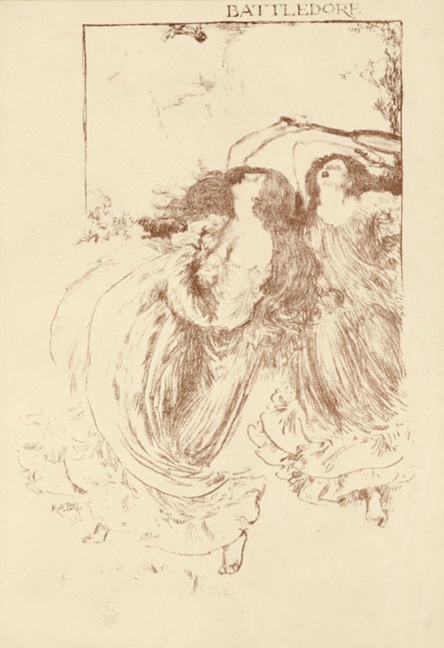 The name battledore lived on: Robert Anning Bell’s print from 1896 proclaims this in its title of Battledore, and there’s no sign of any net.