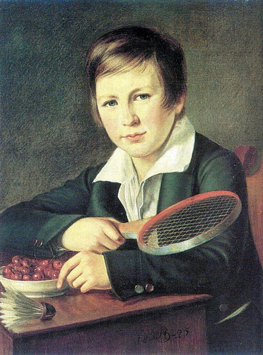 Alexander Varnek’s portrait of the studious young Nikolai Alekseevich Tomilov (1814-1858), aged eleven when he painted this in 1825, holds his racquet and a bowl of cherries. On the desk in front of him is a rather posher-looking shuttlecock.