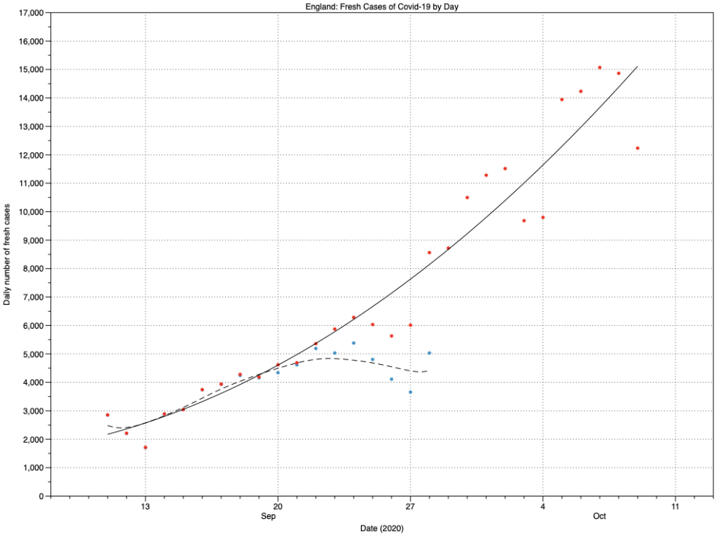A week ago, I published charts here which showed that, far from levelling off, fresh cases of Covid-19 in England were continuing to rise non-linearly. At the time, when daily figures had reached 10,000 on 1 October, I estimated that they were doubling every 9 days. That would mean that they would have reached 20,000 per day on 10 October, and 40,000 on 19 October. So what has happened since?