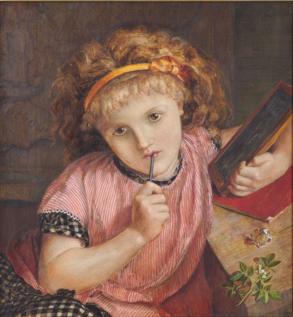 A Deep Problem 9 and 6 Make (1875) shows a young girl with a tablet on which are written some numbers, including the simple sum 9 + 6. She is lost in thought, her mind perhaps drifting from the problem. As with other women painters of this period, the child’s eyes are exceptionally well rendered.