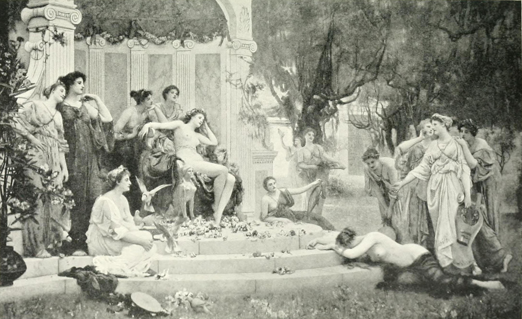 Edward Poynter’s Psyche in the Temple of Love (1882) takes as its theme the contemplative woman. Eros has taken Psyche to the Temple of Love, where he visits her each night, but never in daylight. Here Psyche is whiling away the daytime, holding a sprig out to attract her sole attribute, a butterfly. However, Psyche’s enemy Aphrodite is not far away, as shown by the doves in the temple behind her.