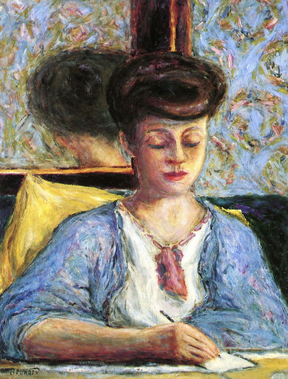 Pierre Bonnard painted a few interiors in which a woman is writing. The Letter from about 1906 is a conventional portrait of a well-dressed woman sitting at a table to write a letter, and may have used Anita Champagne as the model.
